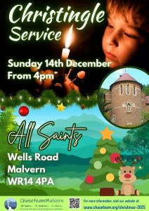 Christingle Service 14/12/2025 Every Year 16:00 – 17:00 All Saints Wells Road Malvern WR14 4PA Get Directions Our popular ‘cafe style’ Christingle Service – come and make your own Christingle whilst we hear again its meaning and at the end of the service we gather around to light the christingles and sing Away in a Manger. Followed by refreshments.